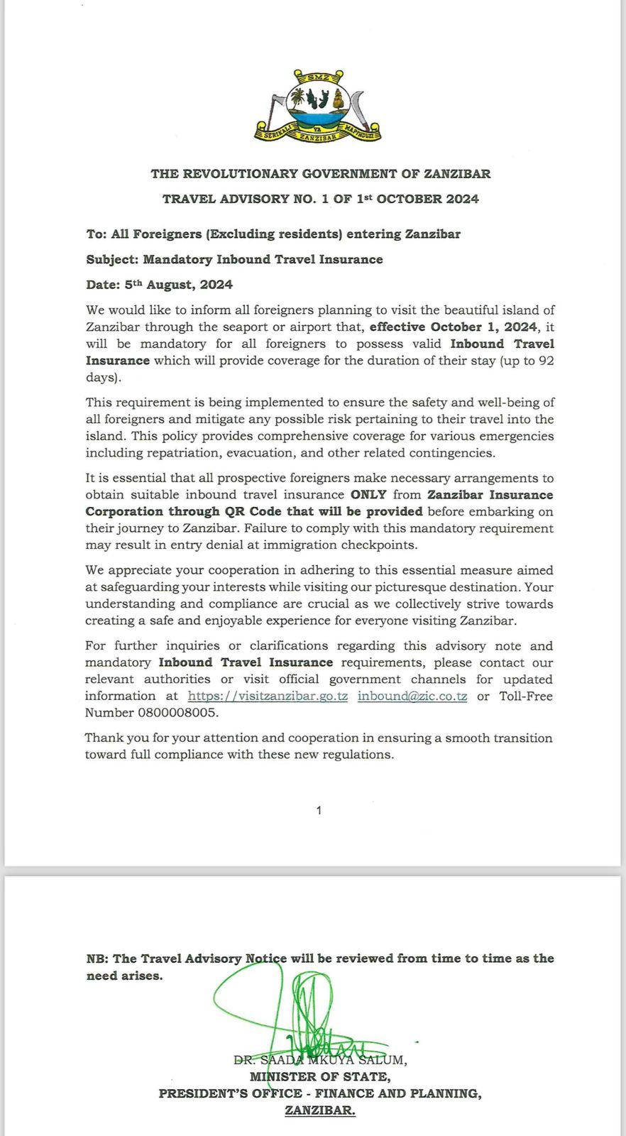 Mandatory Inbound Travel Insurance Requirement for Zanzibar Effective October 1, 2024